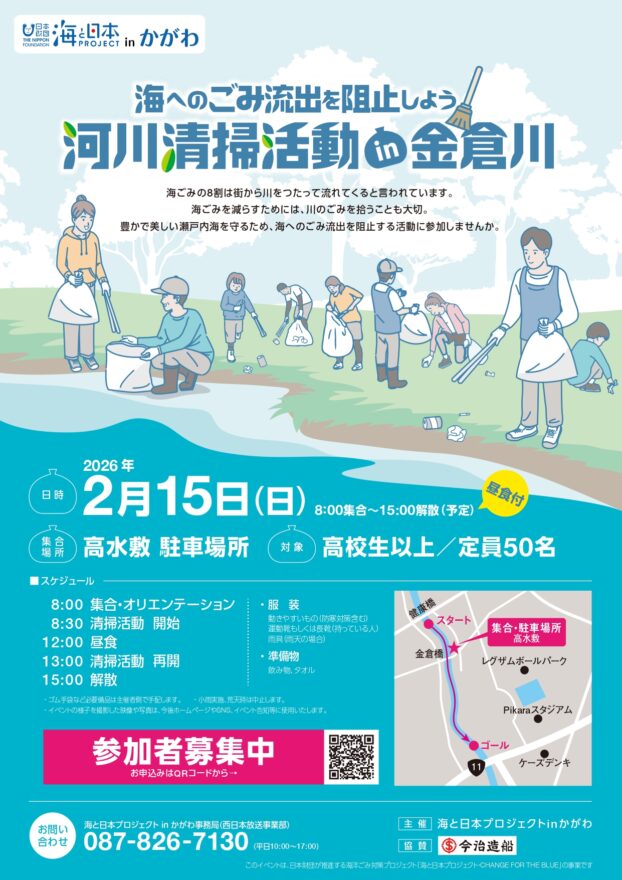 海と日本プロジェクトinかがわでは、2月15日(日)に丸亀市金倉川で清掃活動を実施します。