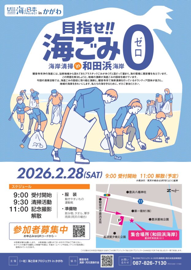 今回の海岸清掃は、海底ごみの回収に取り組む漁師さんと、観音寺市で海岸清掃を行っているボランティア団体が協働で、地域の皆さんと一緒に活動することが目的です。