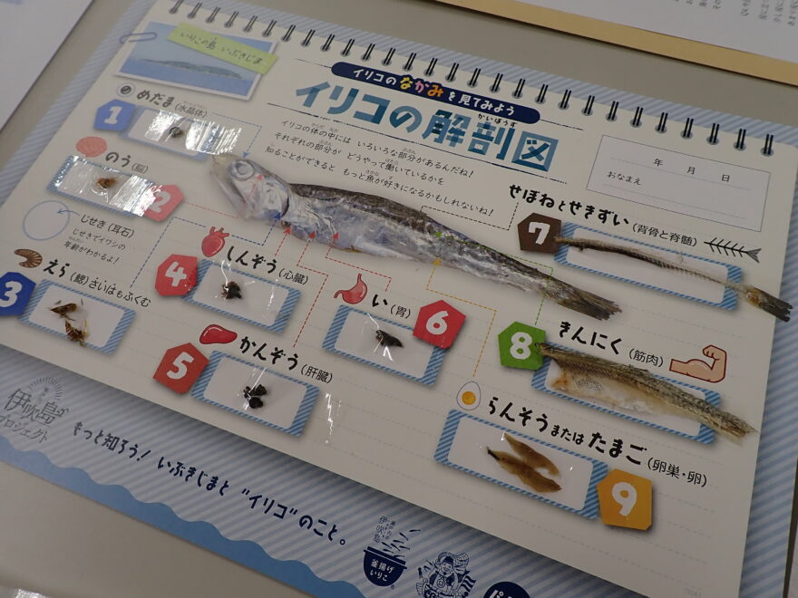 「この小さな魚にも、ちゃんと心臓や胃があるんですよ」と教わりながら、イリコの解剖図を見比べて観察しました。
