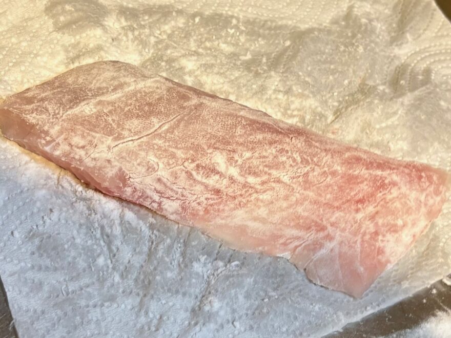 ②薄力粉か片栗粉をふる。身の方だけにふると皮がパリッとなります。