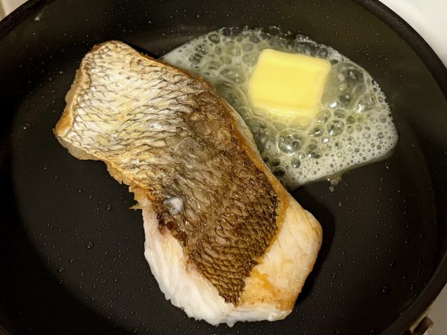 ④皮がパリッとしてきたらオイルをふき取って裏返しバターを投入。弱火のままじっくり焼きます。