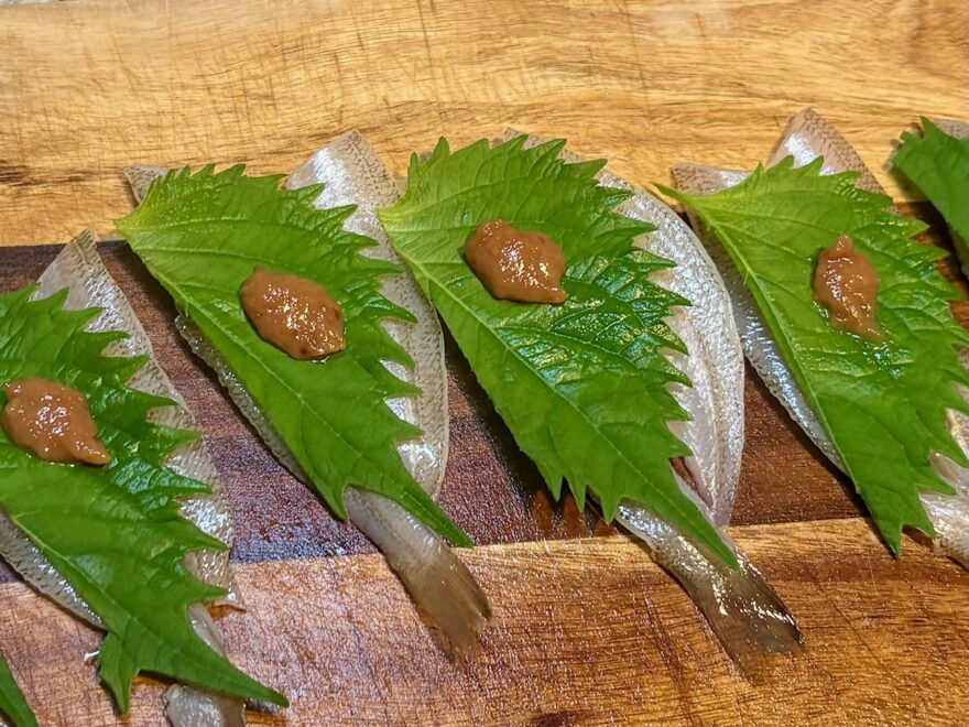 ②水分をふき取って小麦粉を振り、シソと種を取って刻んだ梅干しをのせる