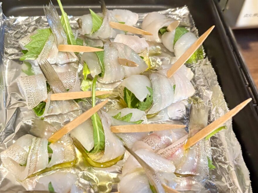 ④魚焼きグリルのバッドにアルミホイルを敷きキスをのせたらオリーブオイルを振りかける