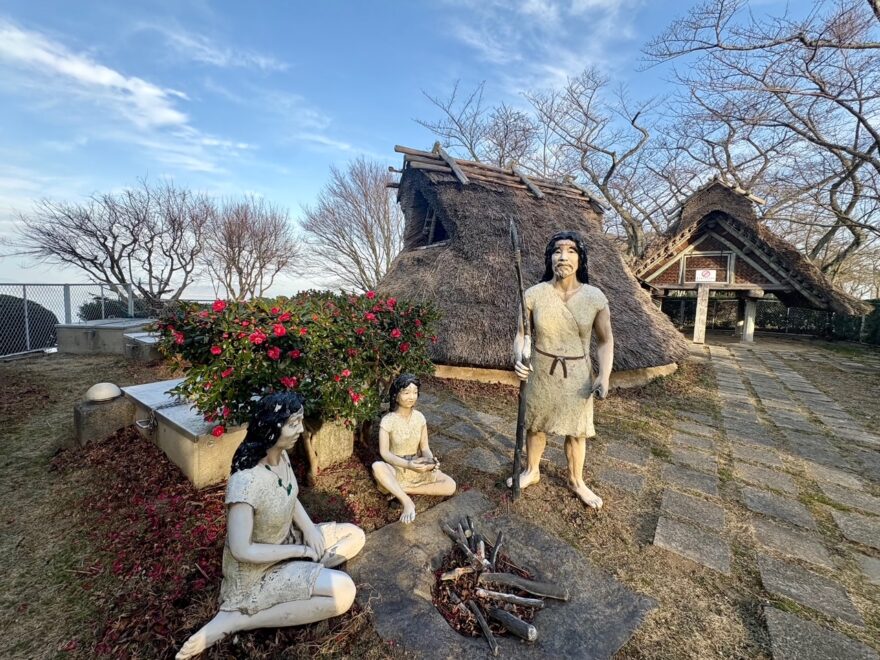 山頂には遺跡展示室や、この周辺で発見された竪穴住居・高床倉庫の再現がされていますよ。