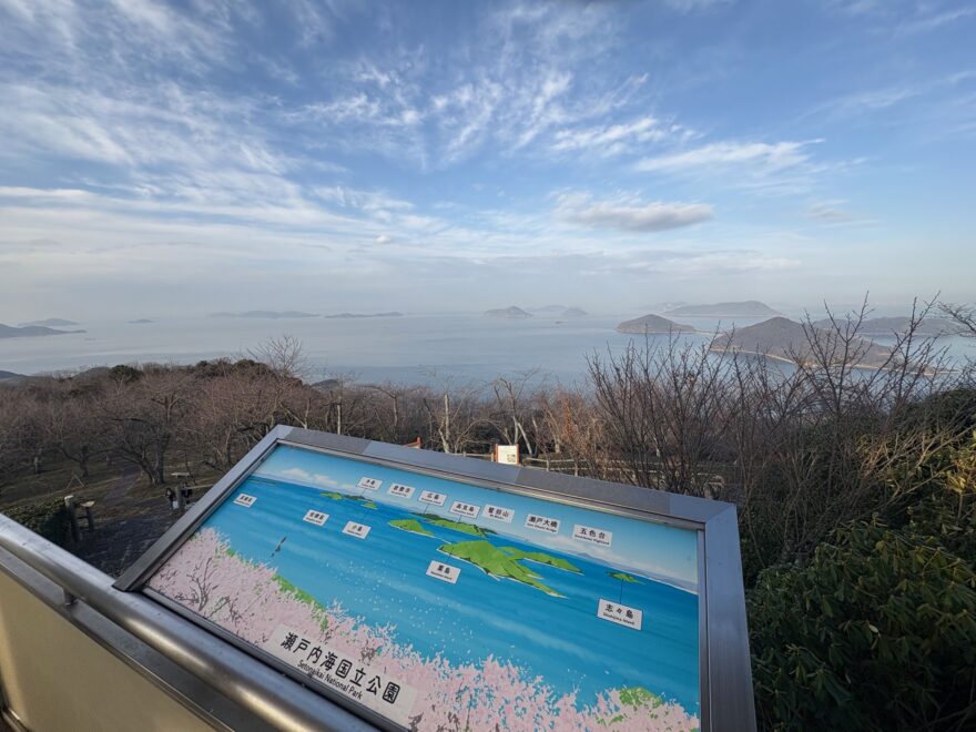 展望台の南から西にかけては、愛媛県四国中央市から、観音寺沖にあるイリコで有名な伊吹島を。東から北にかけては、瀬戸大橋や瀬戸内海の多島美を手に取るように見渡せるんです。