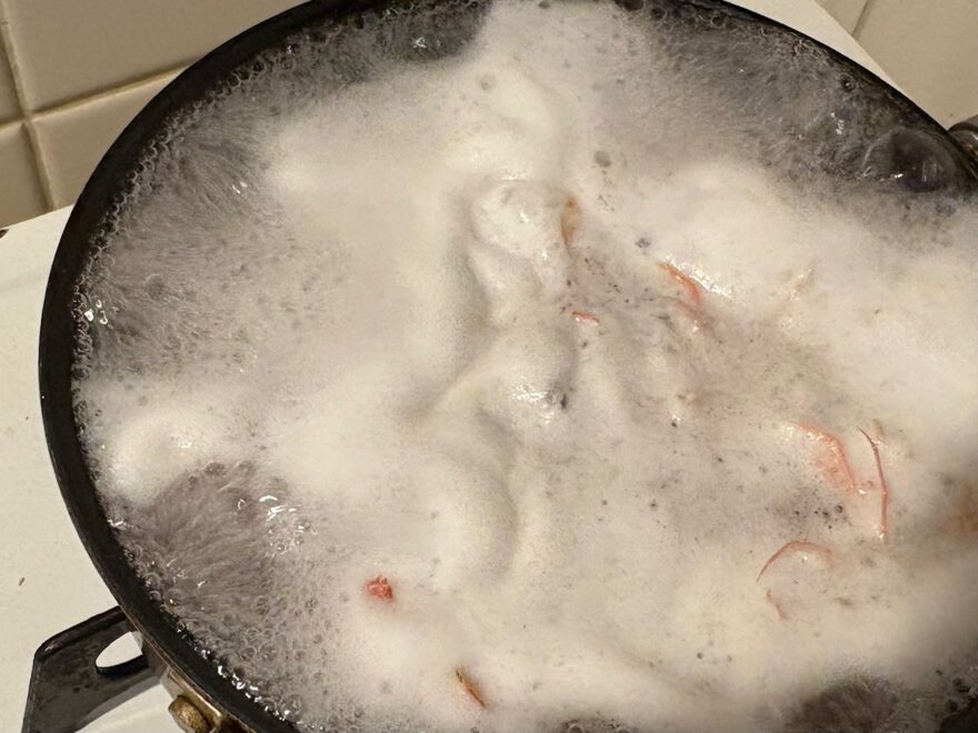③しばらくすると、ぶわーっと泡とアクが出てくるのですくって取り除きつつ2分程茹でます。